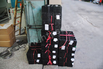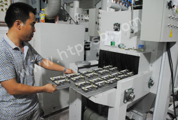 将装满产品的制具依次放入 喷砂机输送平台进行喷砂作业