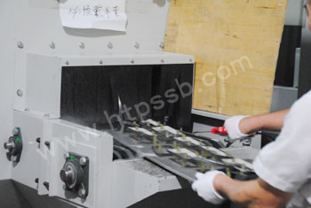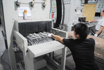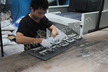 将产品送入喷砂机进行背面喷砂作业